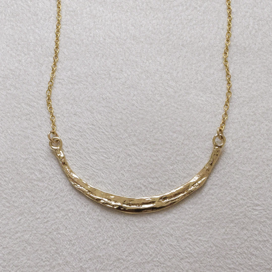 Inspired by the moon as our guide this is the essential wear-every-day necklace. Hand-forged 14kt gold-filled crescent piece hangs on 14kt gold-filled 17″ chain. Perfect for layering or lovely on its own.
