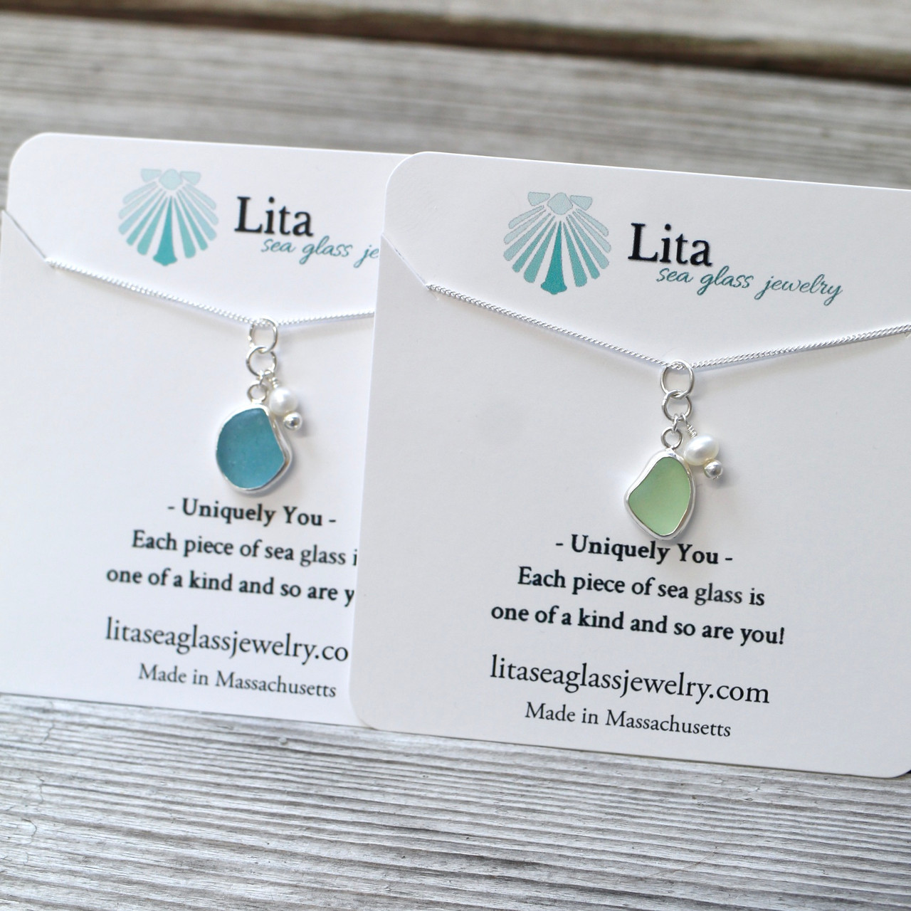 This simple sea glass and pearl necklace is the perfect gift! A pretty drop shape of authentic sea glass has been gently encompassed in sleek sterling silver and is accented with a shimmering fresh-water pearl. It hangs on a lovely 18″ sterling silver small link chain. This necklace comes on a card that reads “Each piece of sea glass is one of a kind and so are you!”